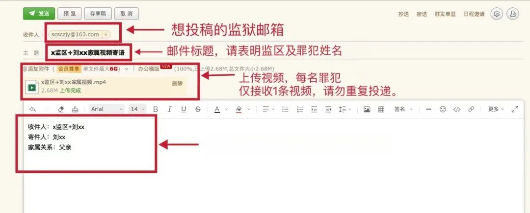 1.邮件正文需注明罪犯的监区及姓名、视频投稿人姓名及家属关系等信息(家属限定为罪犯的父母、配偶、子女、兄弟姐妹等直系近亲属)。