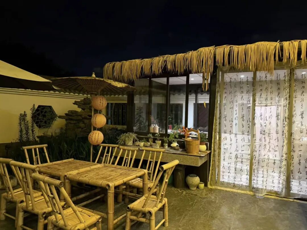 眼前的沈庄民宿,处处透着一股雅致的古色古香。门口悬挂的红灯笼轻轻摇曳,墙边错落摆着各式盆栽,竹椅、茶台随意散落在檐下,一旁的遮阳伞半敞着,显得格外清静闲适,与三公里外上海迪士尼乐园的热闹恍若两个世界。