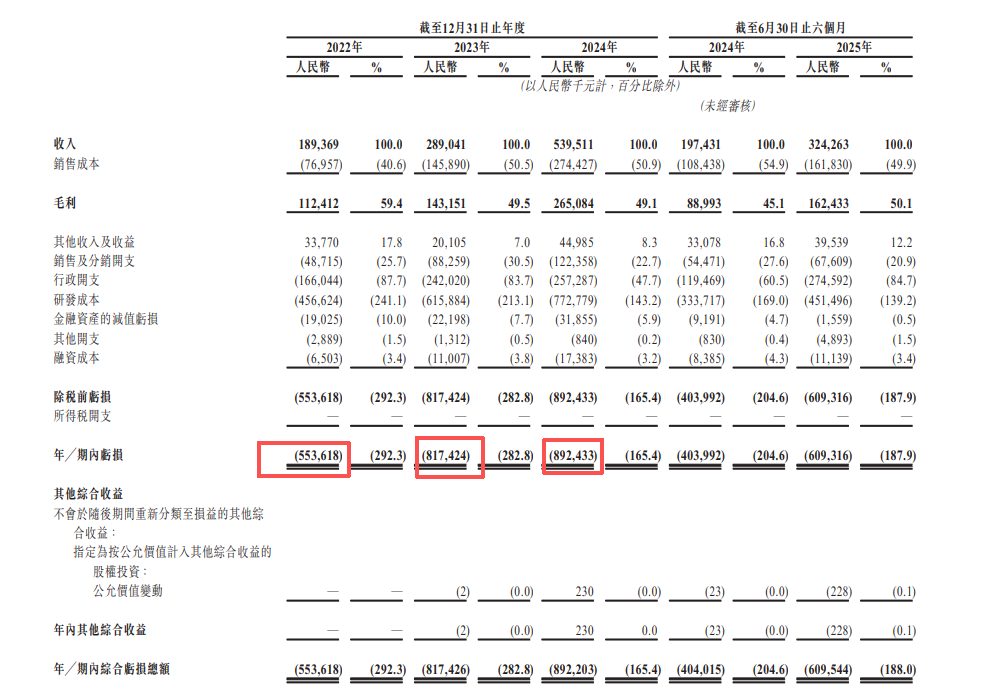 招股书显示,该公司在2022年至2024年,其净亏损分别为人民币5.54亿元、8.17亿元及8.92亿元,三年累计亏损超22亿元。2025年上半年亏损额仍高达6.09亿元。
