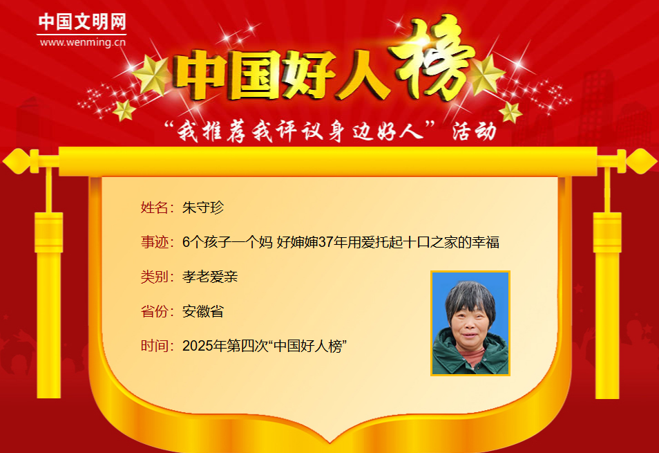 朱守珍,女,1963年7月生,合肥市蜀山区小庙镇新民村村民。37年前,面对丈夫兄长家庭突遭变故,朱守珍将4个年幼的侄子侄女接回家中,与自己的2个孩子共同抚养。多年来,她与丈夫携手肩负起照顾长辈、抚育幼子的重任,以无私的关爱与坚定的责任感,守护着这个特殊大家庭的温暖与和睦。如今,孩子们皆已成才立业,而朱守珍一家仍延续着孝老爱亲、和睦互助的优良家风,续写着平凡却动人的亲情篇章。