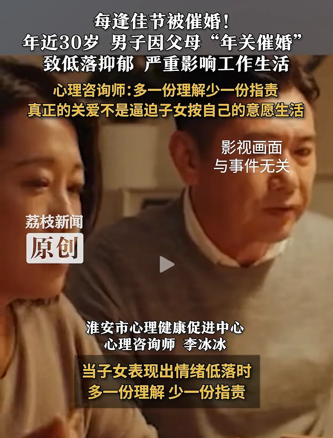 年近30岁男子因父母频繁催婚,导致情绪低落抑郁,严重影响工作生活,甚至不敢回家过年!心理咨询师提醒→
