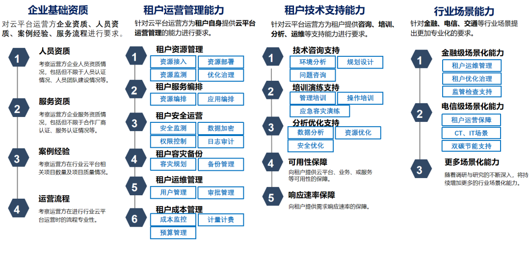 中国信通院2023年发布Q/KXY HY001《行业云平台运营管理能力成熟度第1部分:租户运营》标准,面向行业云平台运营方,从企业基础资质、租户运营管理能力、租户技术支持能力、行业场景能力4个维度,对行业云平台运营方为租户提供的运营能力进行考察,包含22个能力子项,55个能力指标。