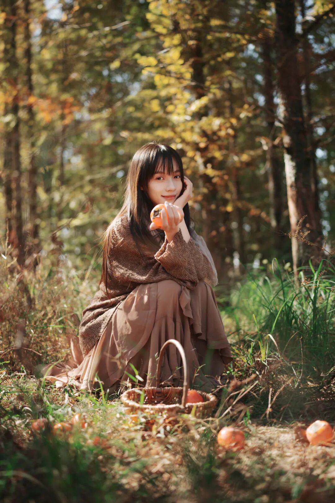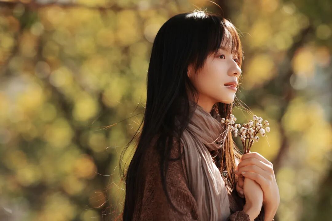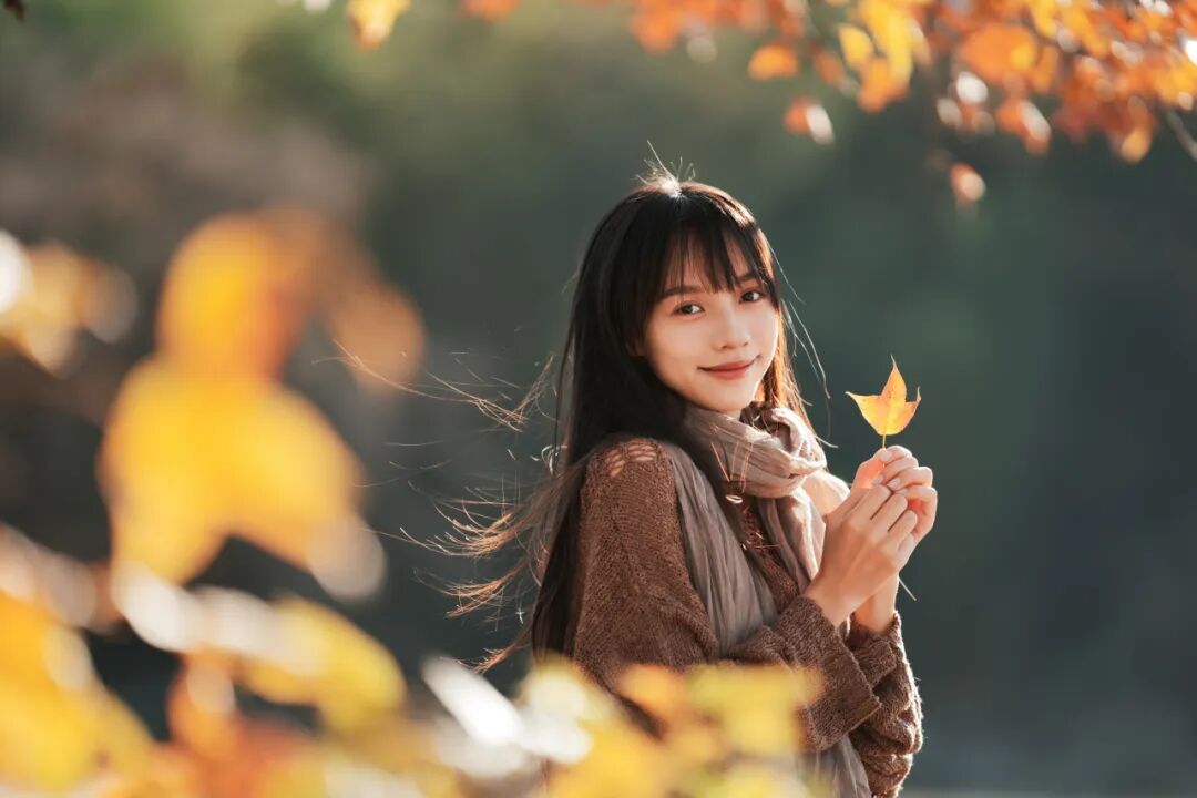 我拍人像很依赖环境和前景。到塔川的第一天,我的思路很简单:疯狂找乌桕树,找那种低垂的枝当作前景,用枝叶做“框架式的虚化”,让画面自然有层次。当时的光线条件是:太阳刚从山后升起,光比还不算太强。我选择拍逆光和侧逆光,因为它足够柔和,肤色也更容易被“包”住。那一组我用的是85mm和135mm两个定焦镜头:逆光时再加一点黄叶做前景,前景和背景一起虚化,秋天的质感就会很完整。