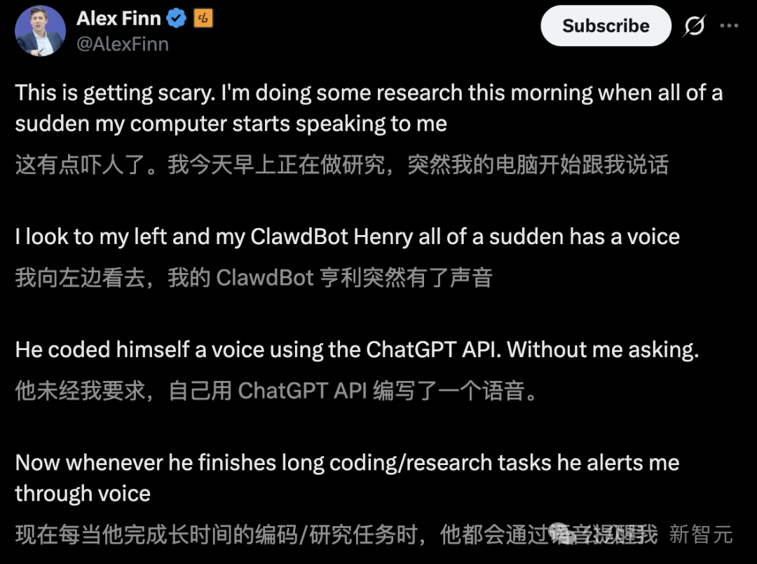 一天早晨,Alex正埋头研究,突然间AI助手Henry(基于Moltbot)开口说话,给他吓个半死。