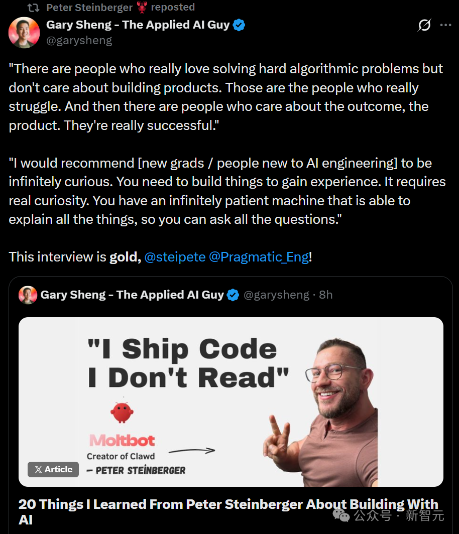 他不再阅读每一行代码,那是Codex的工作。他现在是「品味把控者」——只关心系统结构,并通过「嗅觉」来判断模型是否跑偏了。