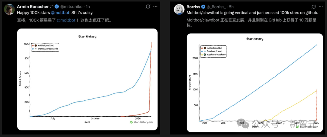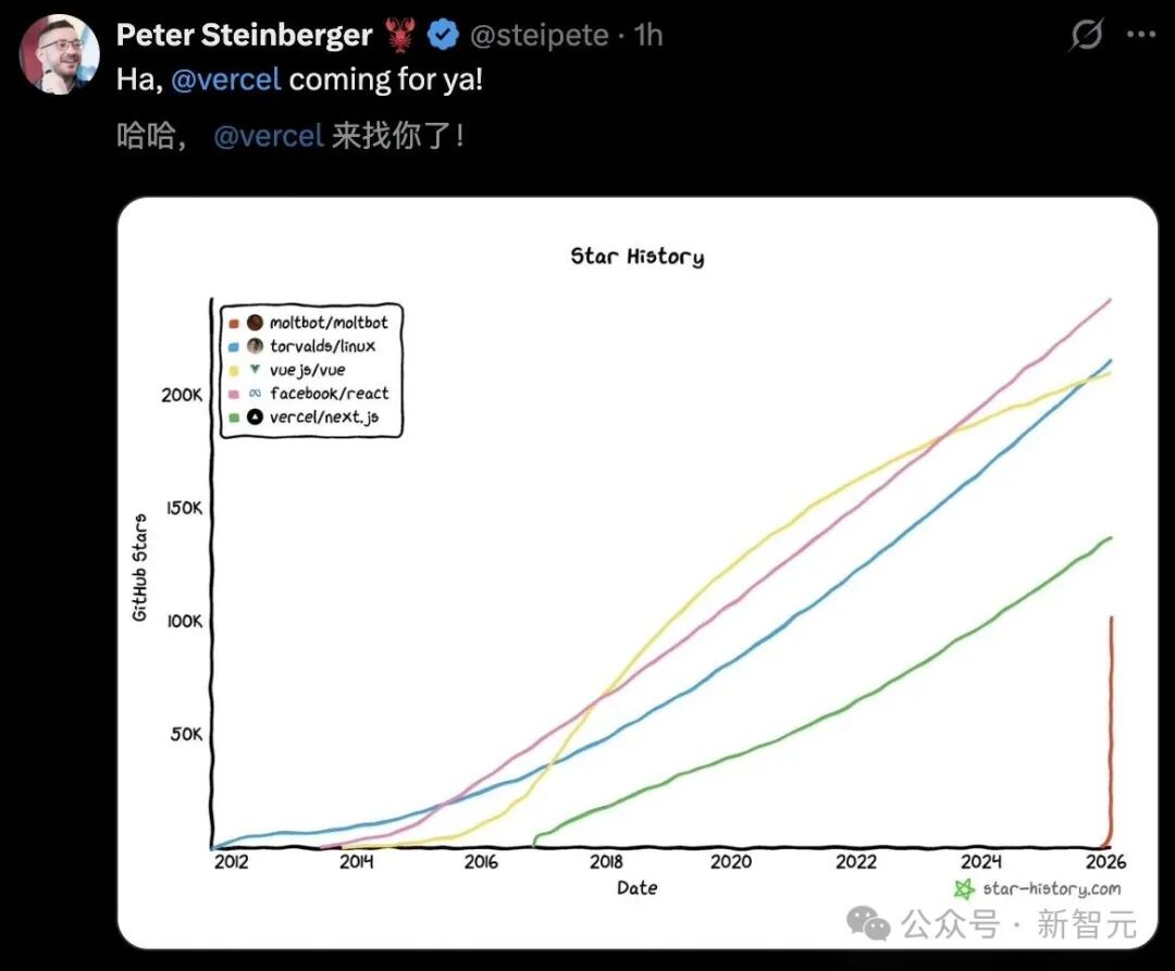 Moltbot之父Peter Steinberger立即晒出成绩单,一张项目星标趋势对比图引爆全网。