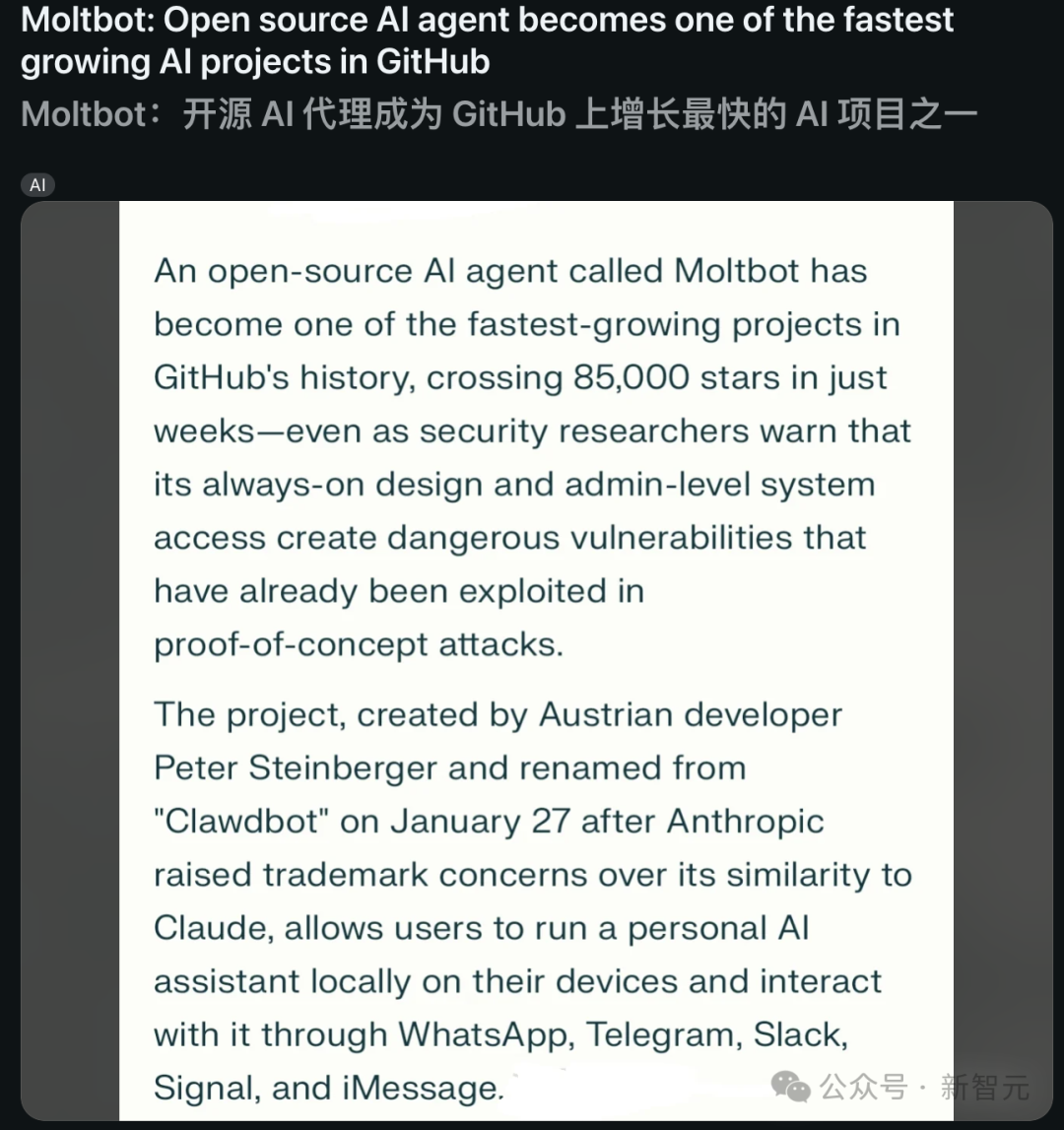 如今,全网都为之震惊,有人将Moltbot称为「GitHub上的火箭项目」。