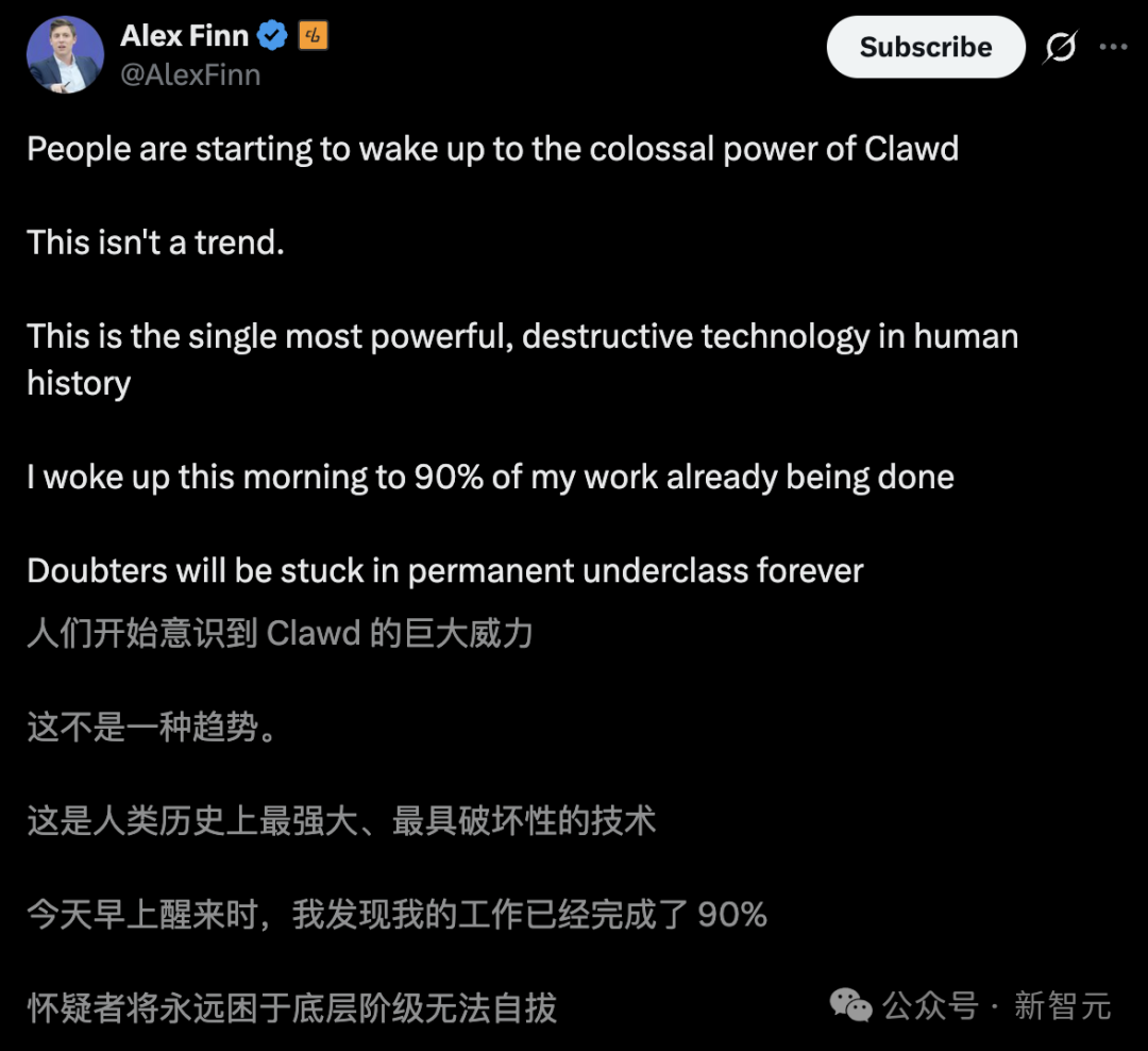初创CEO Alex Finn感慨道,这绝非某种转瞬即逝的流行趋势,而是人类历史上最强大、最具颠覆性的单一技术。