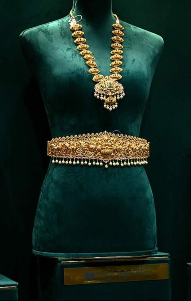 当地时间2026年1月31日,印度海得拉巴,一名店主在一家商店内整理黄金珠宝。