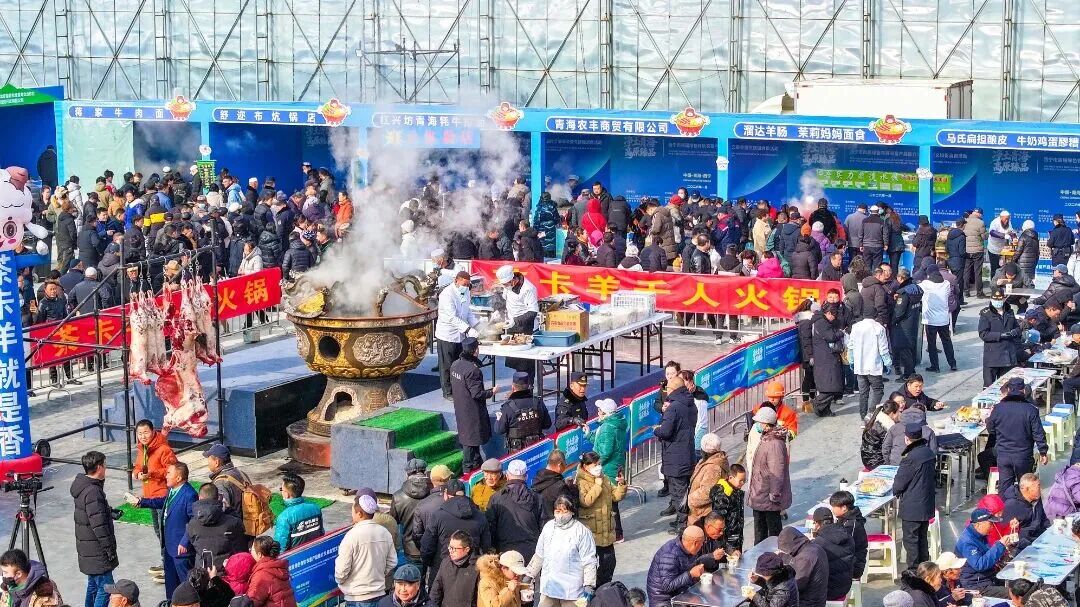 青海西宁城东区年货大集上,千人暖锅宴精彩亮相,巨型暖锅甄选高原优质牛羊肉等食材,尽显暖锅文化魅力。当天,西宁市首届绿色有机农畜产品推介交易暨文旅促消费活动同步举办,舞狮、寸跷轮番上演,更有射箭爱好者同台竞技,让市民在置办年货的同时,沉浸式畅享多元新春休闲体验。