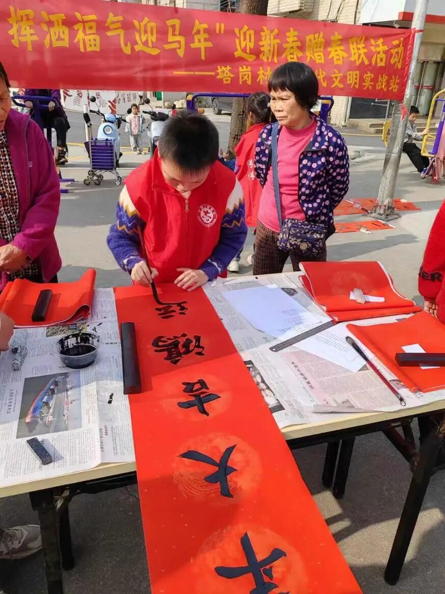 ↑荷塘镇塔岗村新时代文明实践站开展“挥洒福气•春满马年”迎新春送春联活动↑