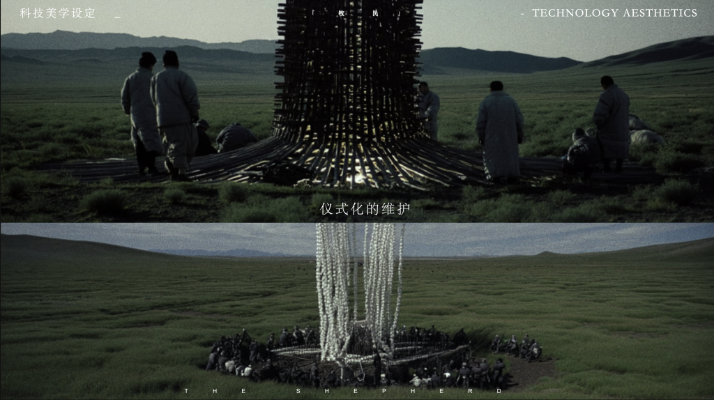 张宇飞解释了这种选择背后的美学追求:一个发生在高原的、关于未来牧人的故事,常规思路会用蒙古长调或呼麦。“但我们选了北欧式的吟唱。想要一种既熟悉又陌生的感觉——像是几百年后,牧民的歌谣变了,但又没完全变。”这种基于文化洞察与哲学想象的“刻意错位”,是算法始终无法触及的创作高度。