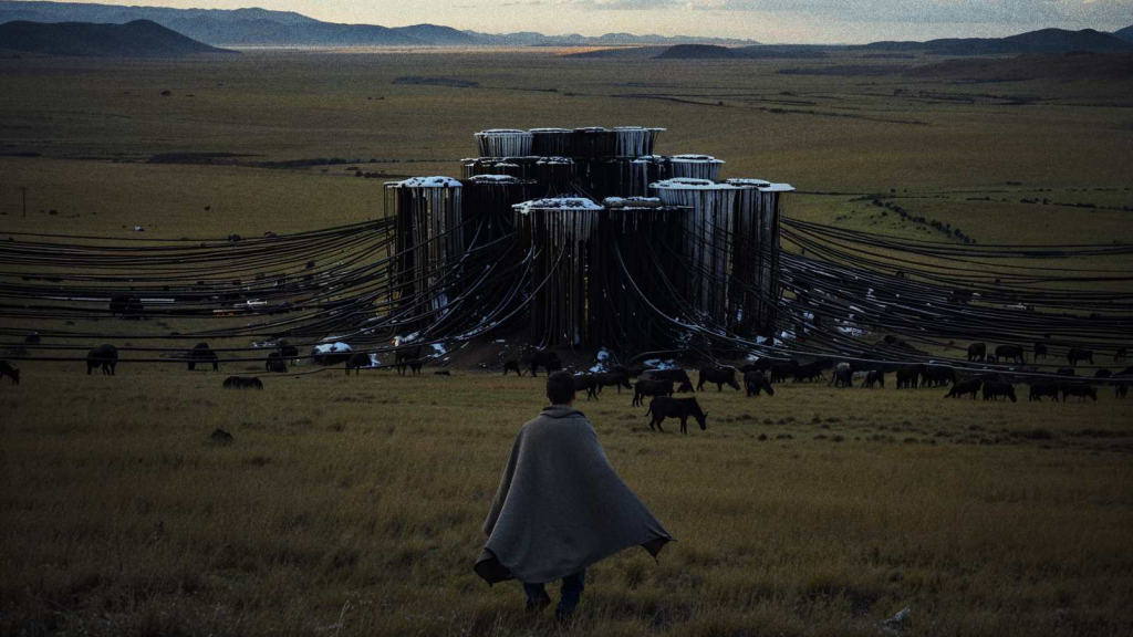 “当时中国把比特币给禁了,大量的小水电关停,‘挖矿’的机器就荒废在那儿了,在川西高原,产生了一些奇观。” 他描述了一幅充满“错位浪漫感”的画面:世代逐水草而居的藏族牧民,与他们身旁那些静静躺在草原上、曾消耗着巨大能量的废弃服务器矿机,形成了沉默的共存……这个强烈的意象,直接催生了《牧民》最原始的概念:“我们想说,当地居民‘放牧’的可能是比特币矿机。”