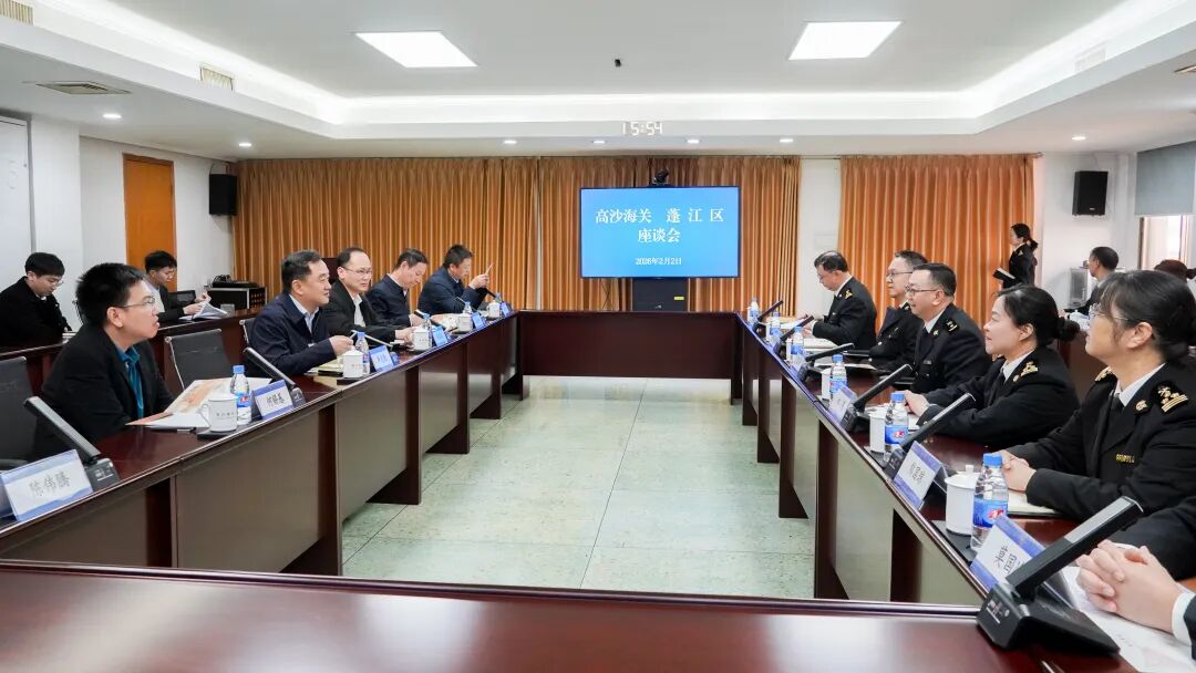 在高沙海关,慰问组观看了2025年高沙海关发展成果视频,回顾过去一年口岸通关流程、监管模式、物流配套等业务运行情况,并就新一年的工作思路进行深入研讨。在各项举措协同推进下,2026年1月份的蓬江外贸已实现“开门红”,为全年稳外贸打下了坚实基础。