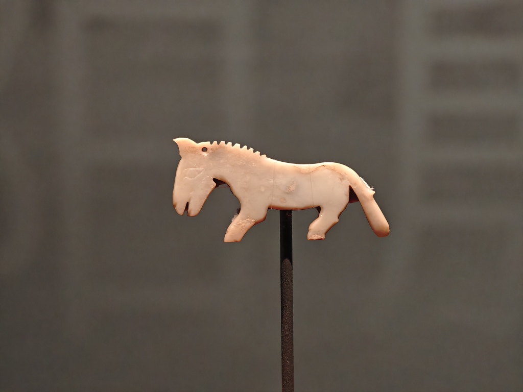 今年是马年,一件妇好墓的玉马吸引观展者驻足。据策展方介绍,这是国内目前所知最早的马形象,它形制小巧,玉质温润,马鬃呈锯齿状,耳后钻有小圆孔,虽造型古朴,但却巧妙呈现出马的灵动姿态。