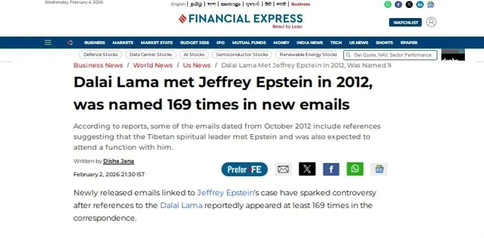 2月2日,印度《金融快报》报道称,达赖喇嘛曾于2012年与杰弗里·爱泼斯坦会面,在美国司法部新公布的爱泼斯坦电子邮件中,达赖的名字被提及169次。