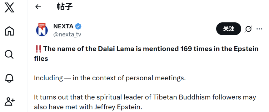 同日,“今日俄罗斯”(RT)在X上发布帖文称,“达赖曾与杰弗里·爱泼斯坦会面——最新公布的邮件。总的来说,在爱泼斯坦的文件中,达赖至少被提及169次”。