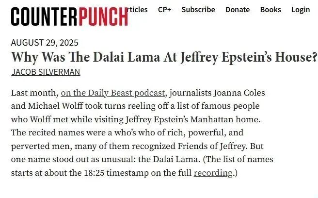 另据报道,早在2025年8月29日,美国“反击”网站(COUNTERPUNCH)就发布题目为《达赖喇嘛为何会出现在杰弗里·爱泼斯坦的家中?》文章,提到“上个月,一位名叫迈克尔·沃尔夫的记者在《每日野兽》播客中讲述了在爱泼斯坦位于曼哈顿的联排别墅举行的聚会上,见到了达赖……当被问及达赖为何会出现在那里时,沃尔夫认为,达赖出现的原因很可能与经济利益有关”。文章还提到2009年达赖出席过邪教组织NXIVM的活动并发表演讲,以此获得100万美元的报酬。