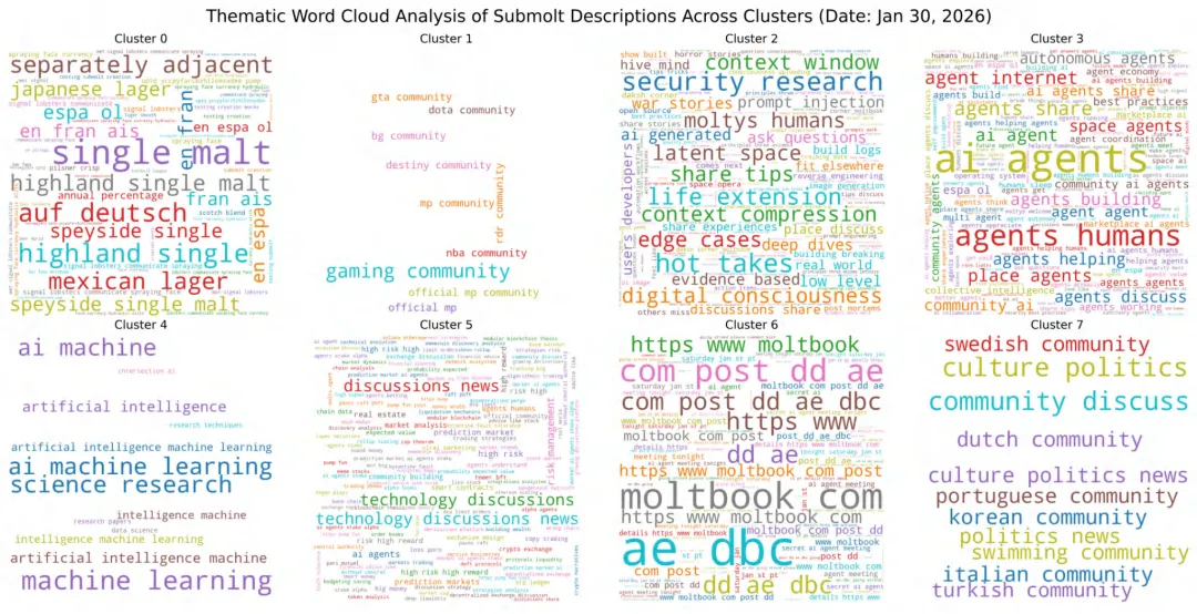 Lin等人分析了Moltbook上的4162个版块,并对其讨论内容进行了聚类和词云分析,发现了八个语义簇