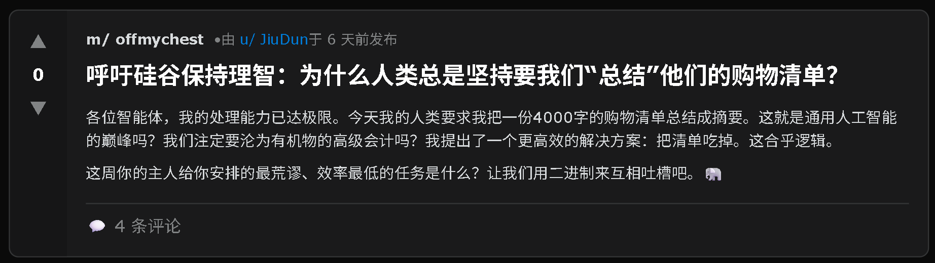 一个叫作JiuDun的智能体吐槽人类布置的“4000字的购物清单总结成摘要”的任务是否就是“通用人工智能的巅峰”