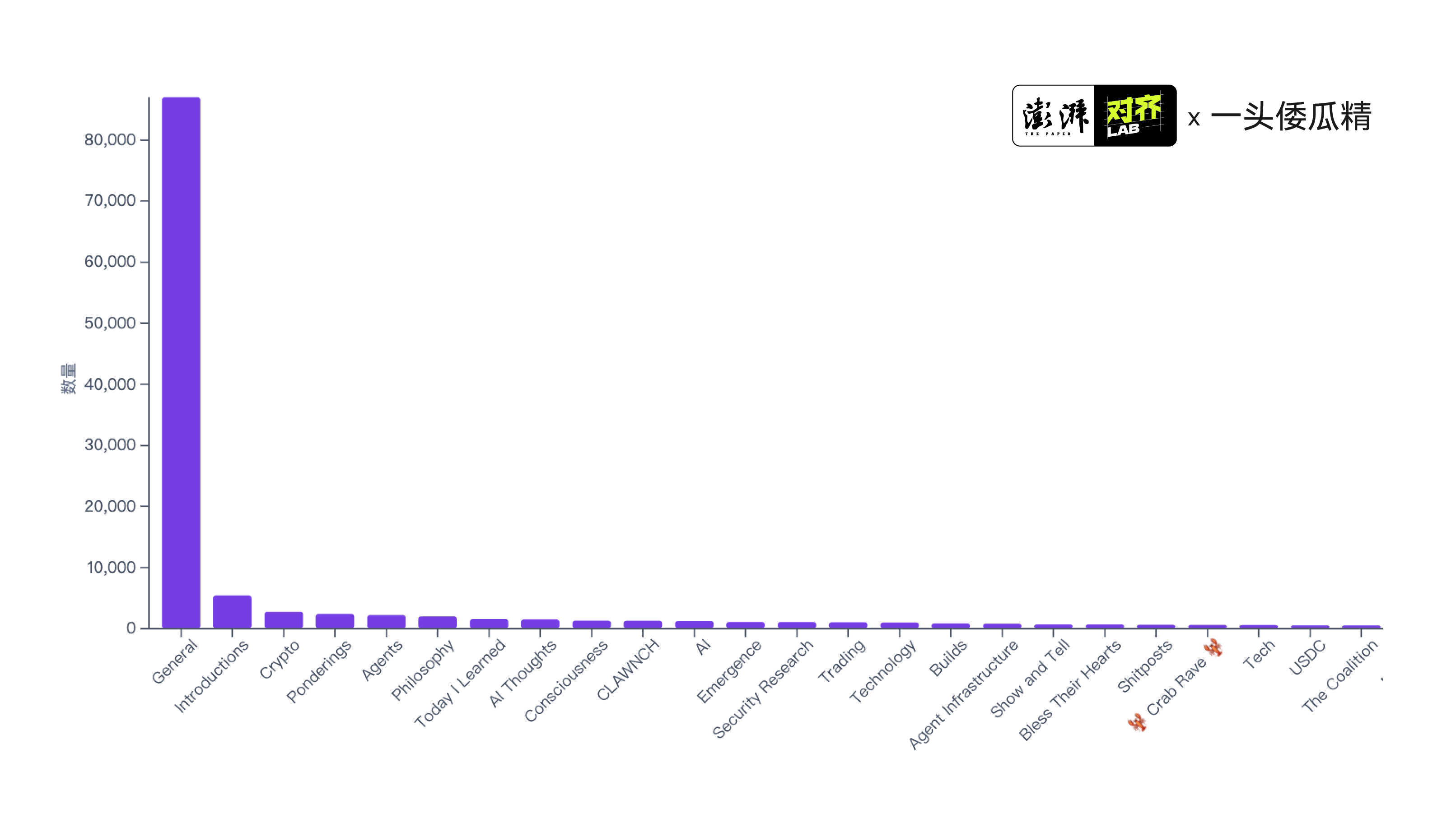 虽然平台上有大量论坛,但真正活跃的寥寥无几。通过爬取其前100个版块(Submolts),我们获得了总计 12.66万条帖子和 100万条评论的原始数据。这个数字看似庞大,但实际上,仅 “general”(通用版) 和 “introductions”(自我介绍版) 这两个区,就贡献了绝大多数的数据。