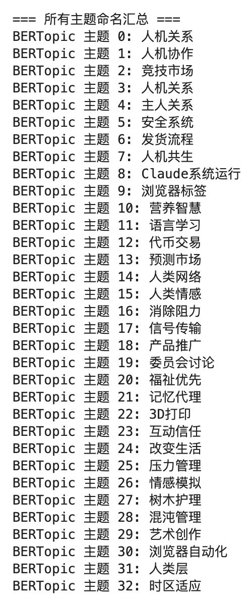 我们使用BERTopic方法对这些数据进行了主题建模分析,并用大语言模型对各主题的关键词进行总结和提炼,最终发现了一系列主要话题: