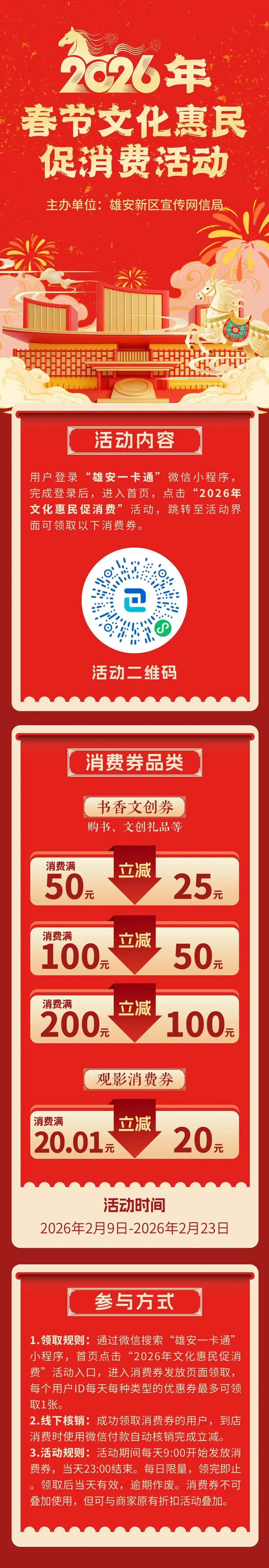为进一步丰富雄安新区群众的精神文化生活,激发市场活力,营造欢乐祥和的节日氛围,2026年元旦以来,雄安新区安排100万元政府消费券,用于群众文化消费。2月9日上午9:00,“2026年春节文化惠民促消费”活动将准时上线。活动力度持续加大,设置满20.01元减20元、满50元减25元、满100元减50元、满200元减100元等多种消费券额度,覆盖购买图书、文创产品,观看电影等消费场景。