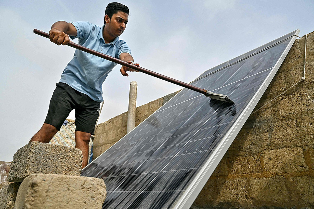 2025年6月23日,巴基斯坦卡拉奇,一名当地居民正在清理自家屋顶安装的太阳能电池板。视觉中国 资料图