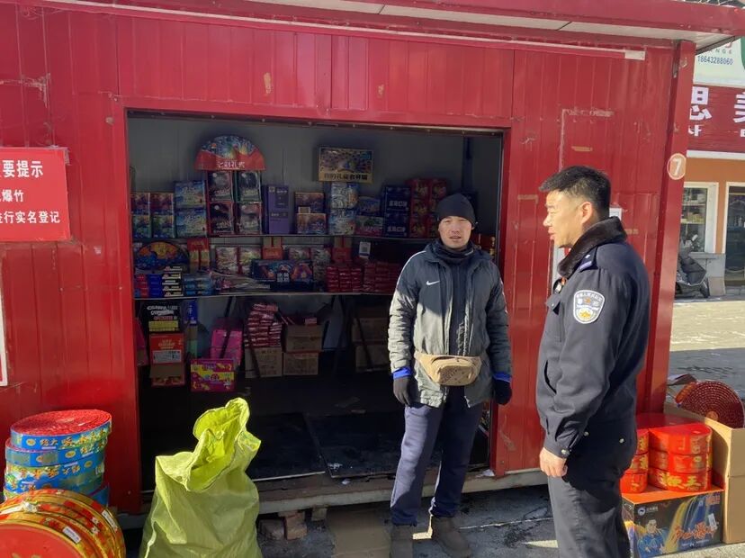 在临时销售摊位,民辅警重点查看各销售摊位是否持有烟花爆竹经营许可证,并对烟花的爆竹存放、销售等情况进行详细了解,询问了近期销售情况。要求销售人员要切实提高思想认识,依法依规进行采购、销售,严格控制留存的烟花爆竹数量,做好每日消防设备检查工作,切实消除各类安全隐患,确保经营环境安全有序。