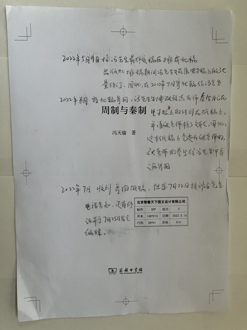 2024年4月13日,在《周制与秦制》出版后,商务印书馆的责编之一石斌先生寄来出版社所存的两捆纸本校样。其中一件的出样时间为2022年5月16日,石斌在上面用铅笔追述道: