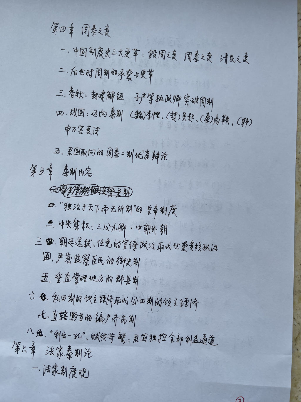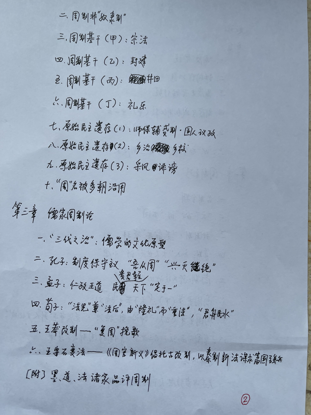 大约在2020年夏天,冯先生的学生姚彬彬教授(时在武汉大学中国传统文化研究中心工作,后调至湖北大学)请他讲述自己的学术经历。讲到生涩处,冯先生随手在一张“废纸”的背面写下几个字,姚彬彬存下了这页纸。上面的信息,其实就是他关于“周制”与“秦制”的部分思考。可见至少在2020年夏天,他已开始构思这一论题。