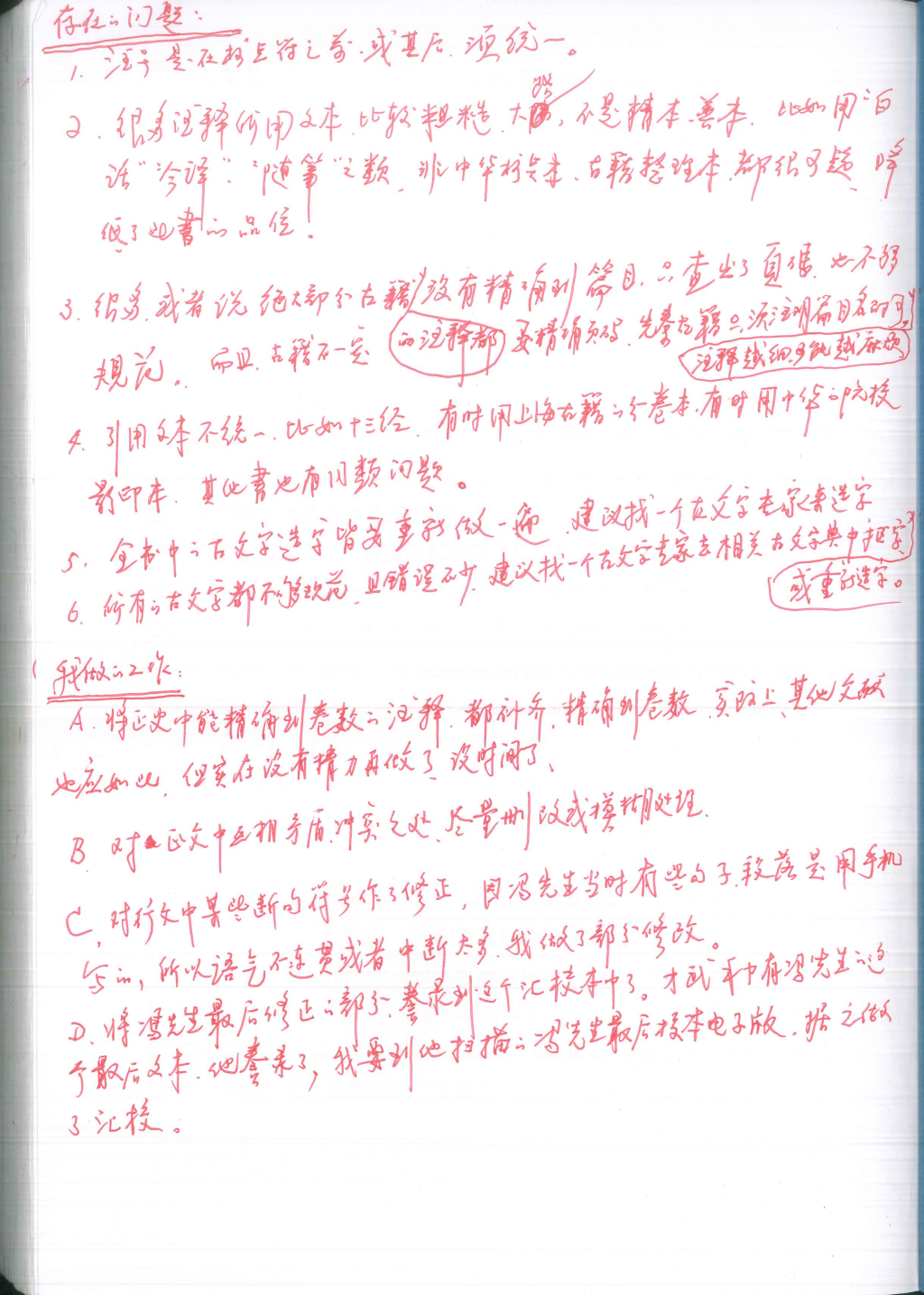 以上工作于2023年8月17日完成,然后扫描备份之后,传回给鲍海燕。为了方便对方的编辑工作,我在这份修订文稿的最后空白页,写明“存在的问题”和“我做的工作”: