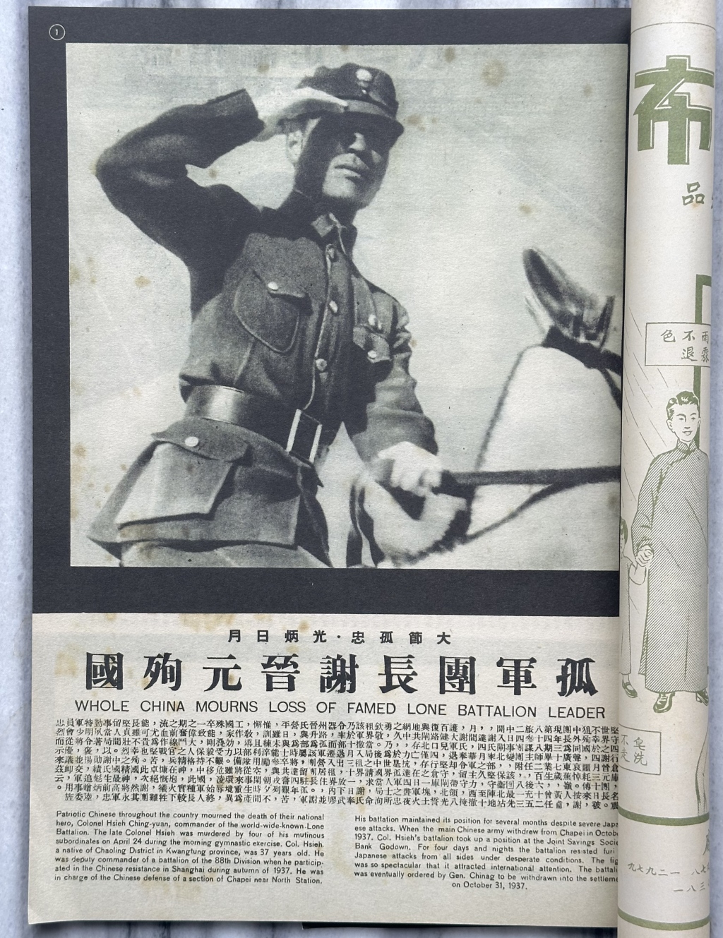 1941年5月15日第166期用9个整版摄影报道介绍谢晋元一生。图为报道的首版版面。
