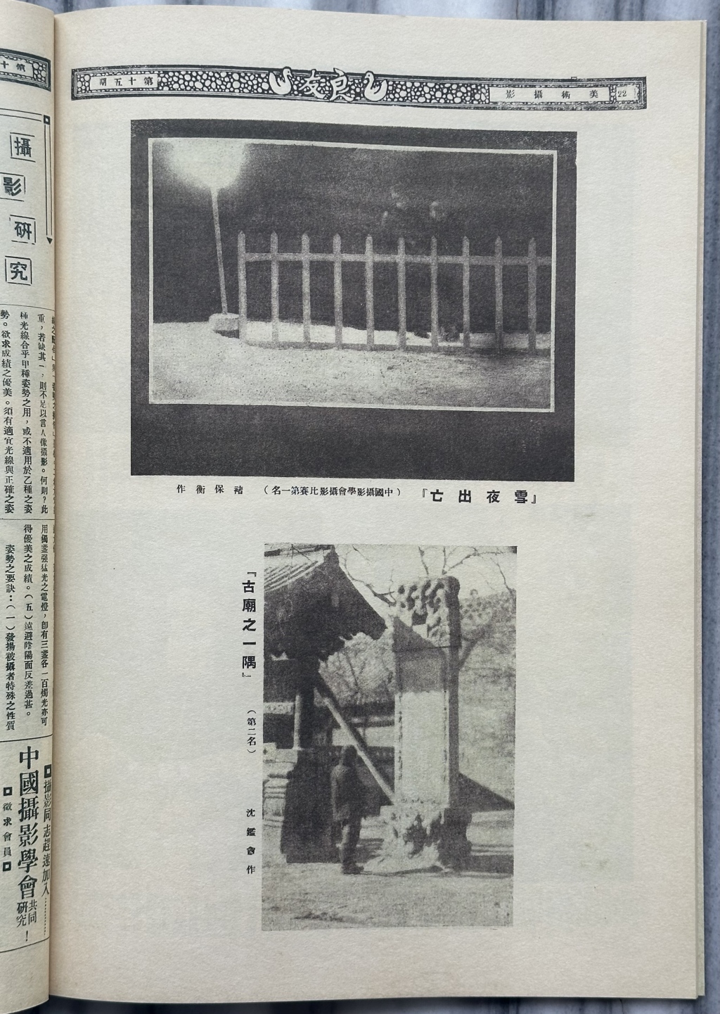 1927年5月30日第15期《良友》画报,以一整版刊发了中国摄影学会举办的摄影比赛,褚保衡荣获第一名的作品《雪夜出亡》和第二名沈鉴盦的《古庙之一隅》。