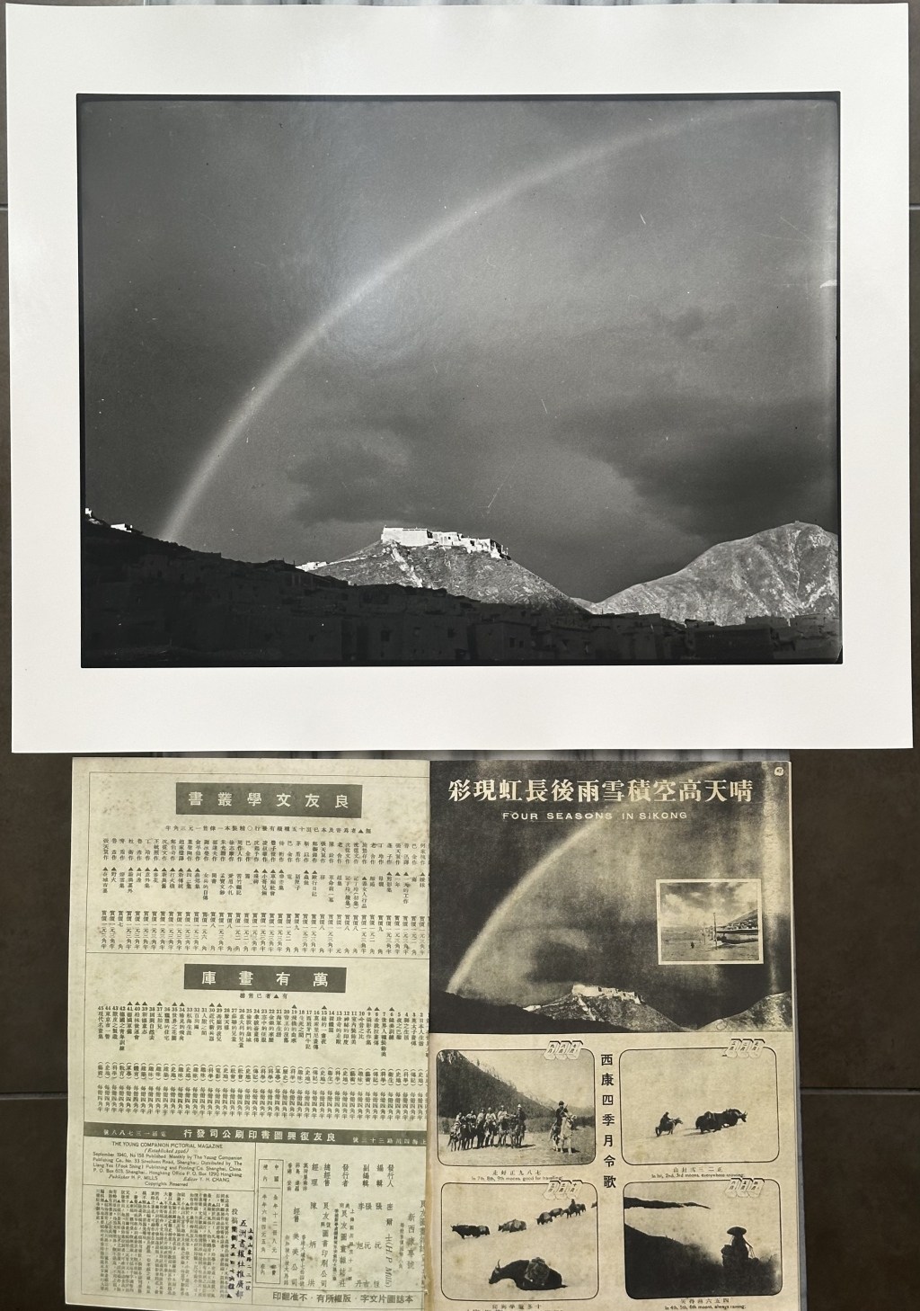 1940年《良友》画报刊发的庄学本摄影专题《西康四季的月令歌》,作品《玉树长虹》在南京博物院展出的《回眸经典——中国摄影大师蓝志贵、庄学本藏族摄影精品展》展览原件,黄建鹏藏。