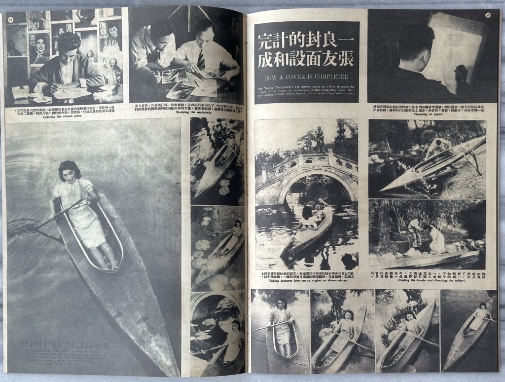 1941年10月出版的第171期,《良友》罕见地公开了封面制作全过程:铅笔设计草图、美编剪贴着色完成彩色稿、摄影师户外拍摄模特与道具、编辑选图、照片着色、制版印刷。这套流程,与今天时尚杂志的封面生产并无本质区别。
