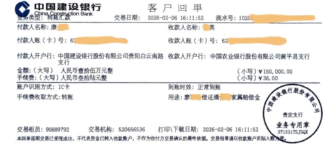 之后,执行干警始终紧盯案件进展,与公安机关保持沟通联动,2026年2月6日,公安机关找到了廖某的行踪,廖某迫于法律的威慑力,在贵定公安干警的陪同下委托其家属到法院当场履行15万元,该案执行完毕。关于第二期赔偿款的后续处置也在有序推进。