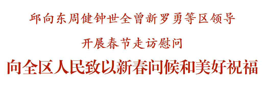 新春佳节即将到来之际,区委书记邱向东,区委副书记、区长周健,区人大常委会主任钟世全,区政协主席曾新,区委副书记罗勇等区领导分别前往部分街镇,看望老领导、困难群众、优抚对象、老党员、专家人才和奋战在基层一线的干部群众等,向大家送去党和政府的关心温暖,向全区人民致以新春问候和美好祝福。