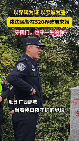 近日,广西百色,戍边民警王燊因守边不能回家,女友叶沛跨越1600公里从湖北武汉奔赴广西边关!在520界碑前,王燊浪漫求婚,与叶沛并肩为界碑描红。