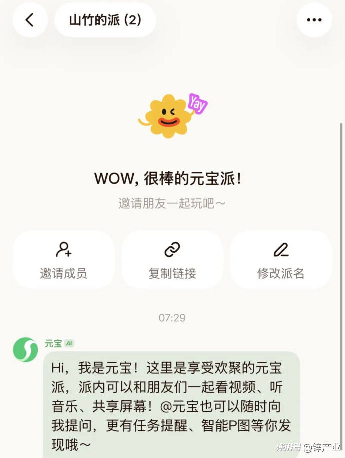 所谓元宝派,是一个加入了AI成员的聊天群(此前在QQ里已经出现过这种模式),在元宝派里,元宝AI作为群聊好友,可以与用户聊天互动、P图二创、共享屏幕,并可以分享腾讯视频、QQ音乐等内容,用户可以与群里好友一起听音乐、看电影。