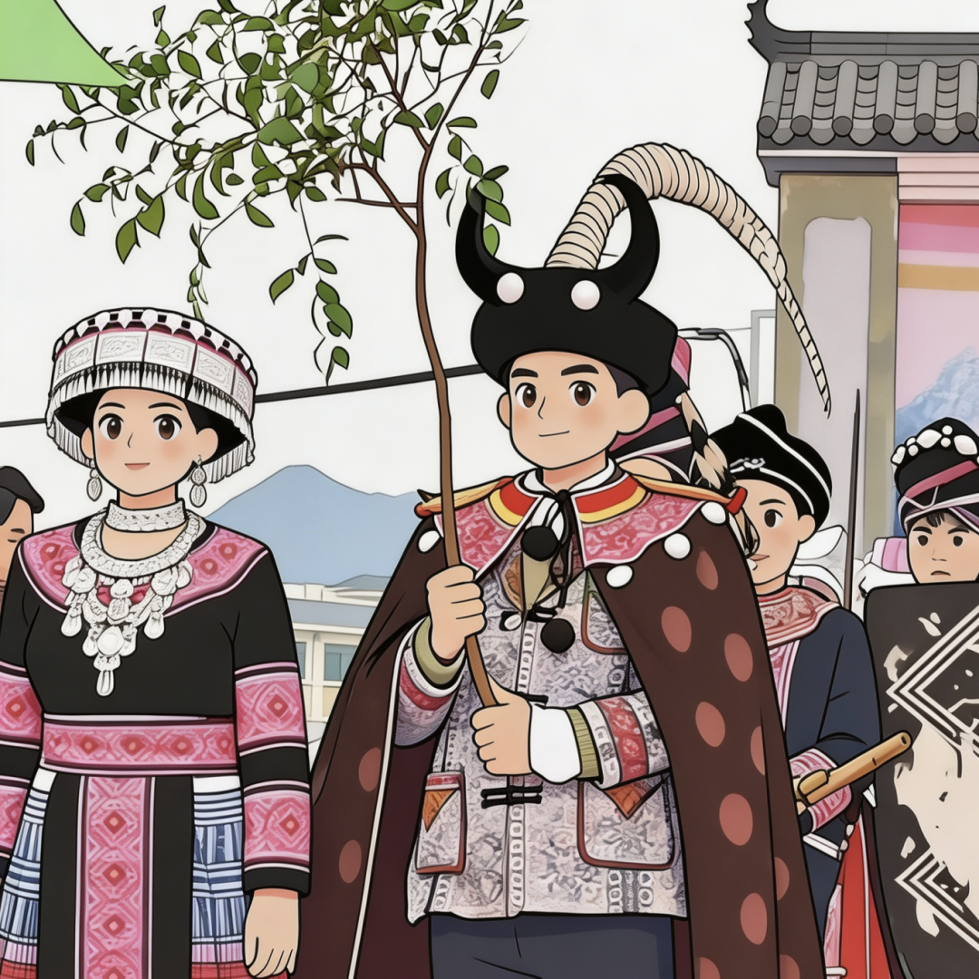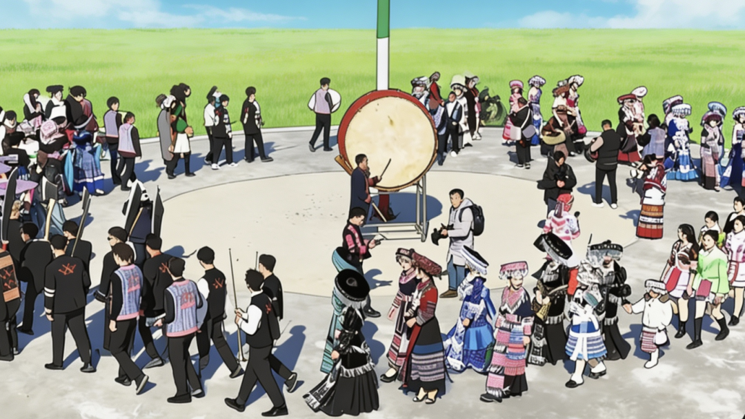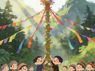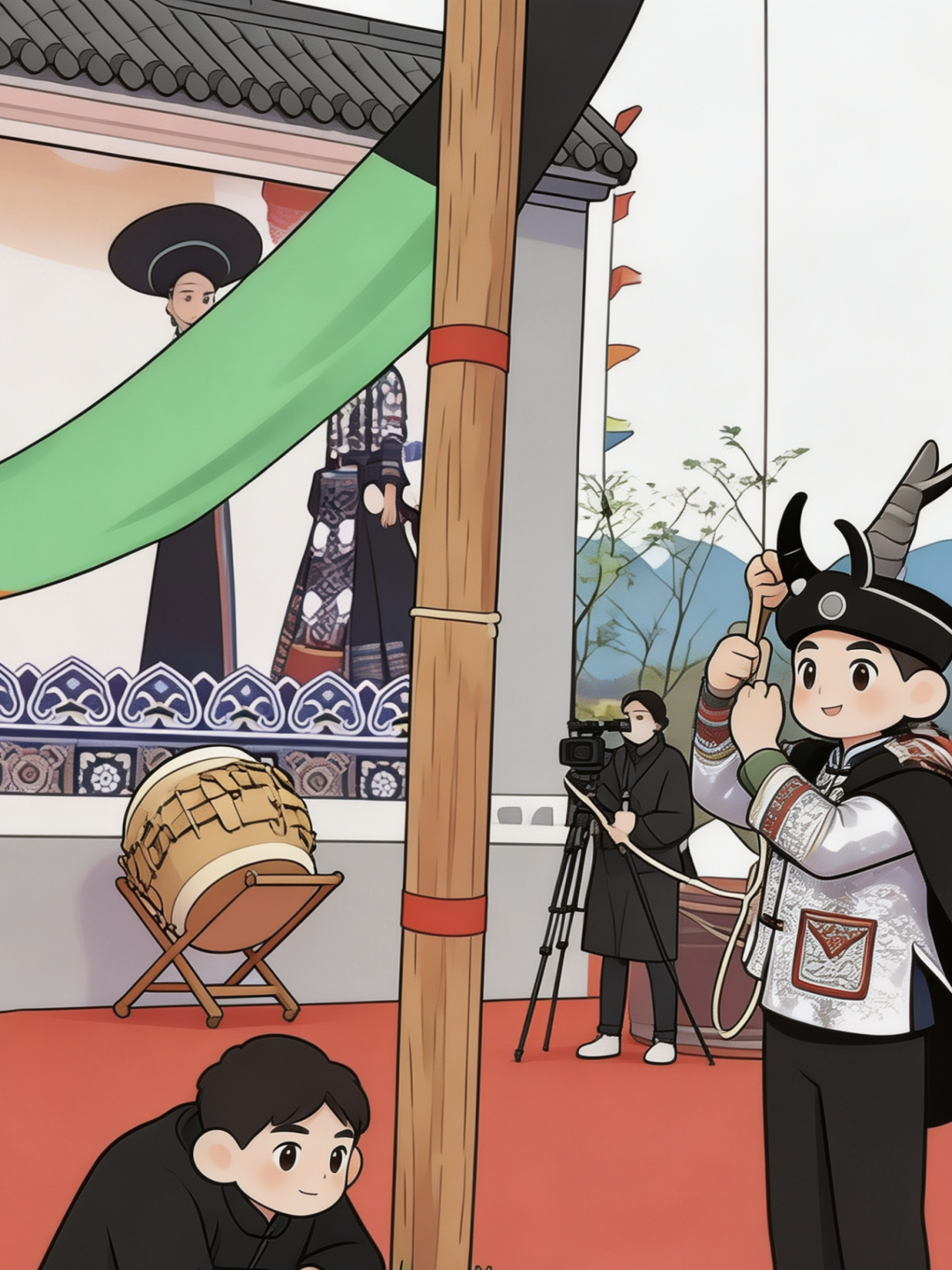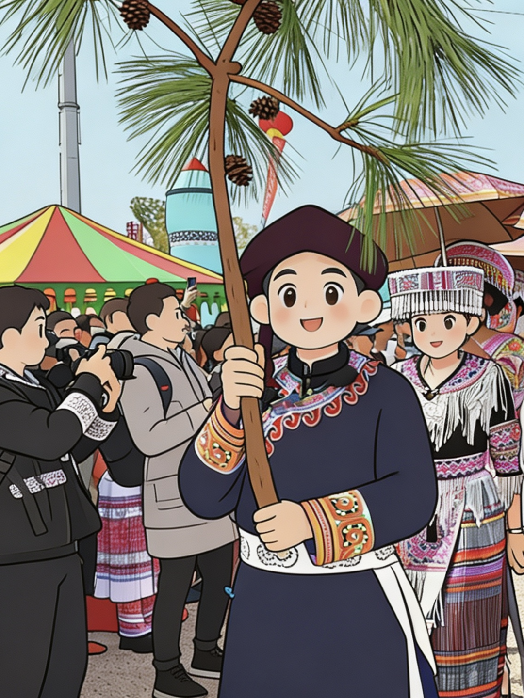 花杆是节日灵魂,农历腊月中旬便开始筹备,选用笔直杉树或竹竿,修枝留梢、朝东立杆,象征苗家生活如花杆枝叶茂盛、常绿常青,发祥地在东方。立花杆是“集结号”,方圆数十里乃至百里同胞一传十、十传百赶来,比春节走亲戚还积极。