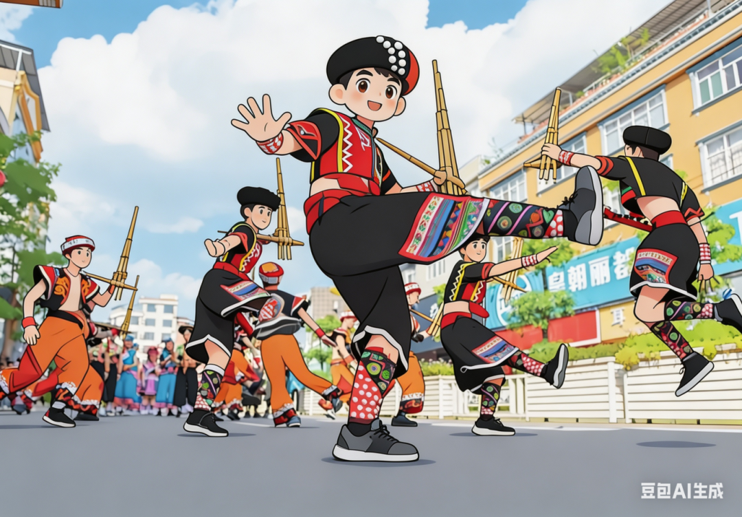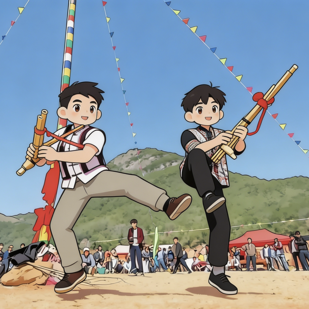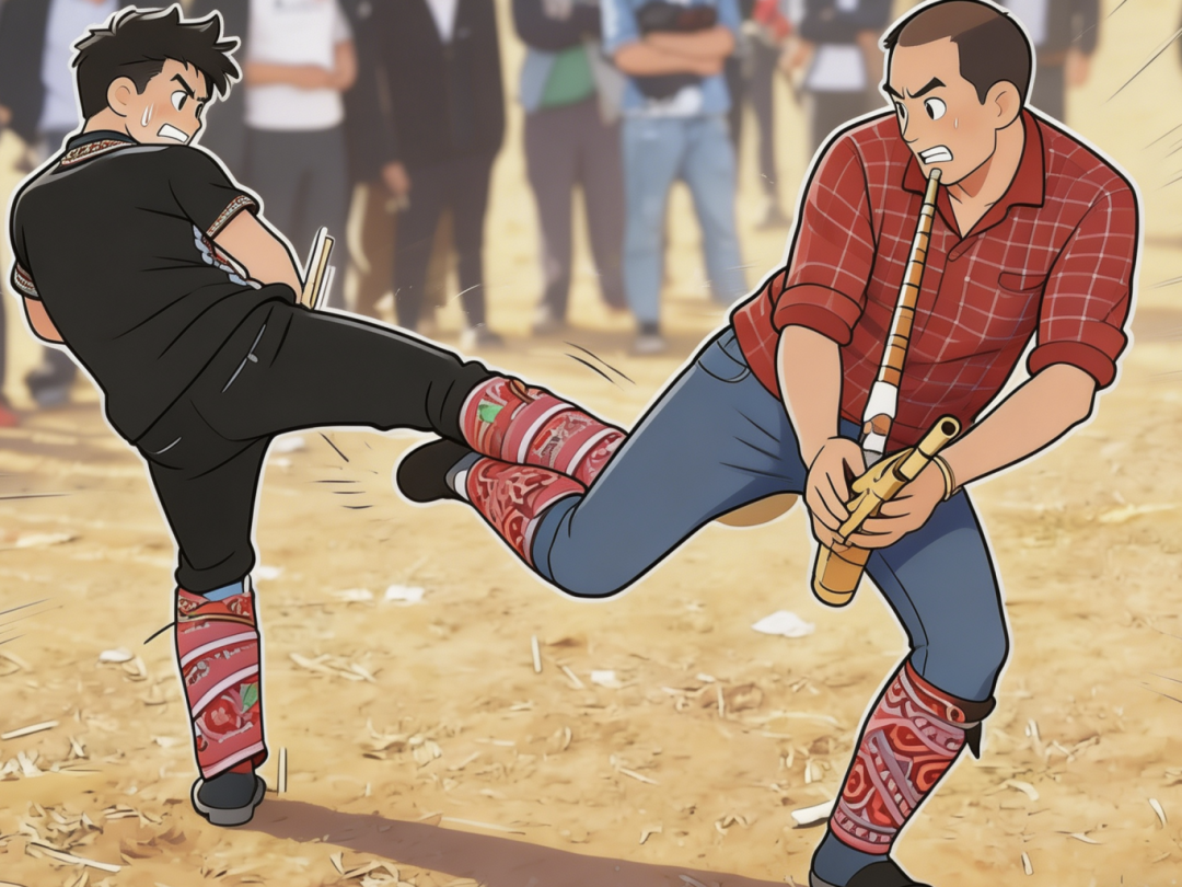 源于芦笙舞,男性青壮年赤脚或穿球鞋参赛,双手不得参战,仅用脚背、脚踝攻击对方腿、臀、背,靠敏捷身手竞技,是春节聚会的“硬核娱乐”。
