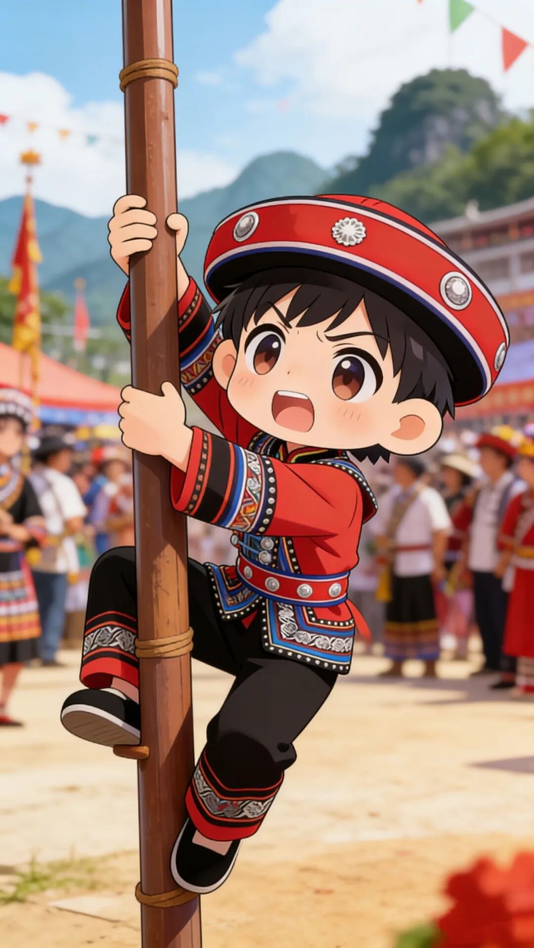 分顺爬(头朝上)、倒爬(头朝下)两种,小伙子们在芦笙曲伴奏下攀杆,堪比“杂技表演”,率先摸到杆顶芦笙或喝到白酒的,直接解锁“花山英雄”称号,妥妥的“高光时刻”,受到人们的尊敬和姑娘的青睐,技艺与惊险兼具,常获雷鸣般掌声。