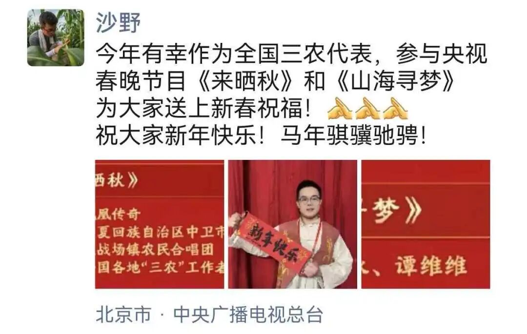此次作为三农代表登上春晚,源于沙野在科技小院的扎根与实践,这位长期深入田间地头的博士毕业生,站在全国观众面前,传递新时代新农人的声音。