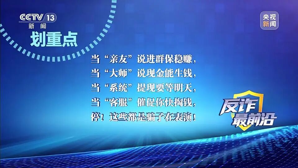 反诈最前沿,我们一起来划重点:当“亲友”说进群保稳赚,当“大师”说现金能生钱,当“系统”提现要等明天,当“客服”催促你快掏钱。停!这些都是骗子在表演!