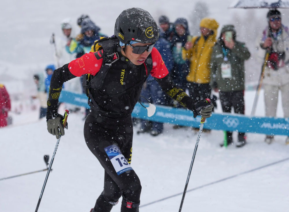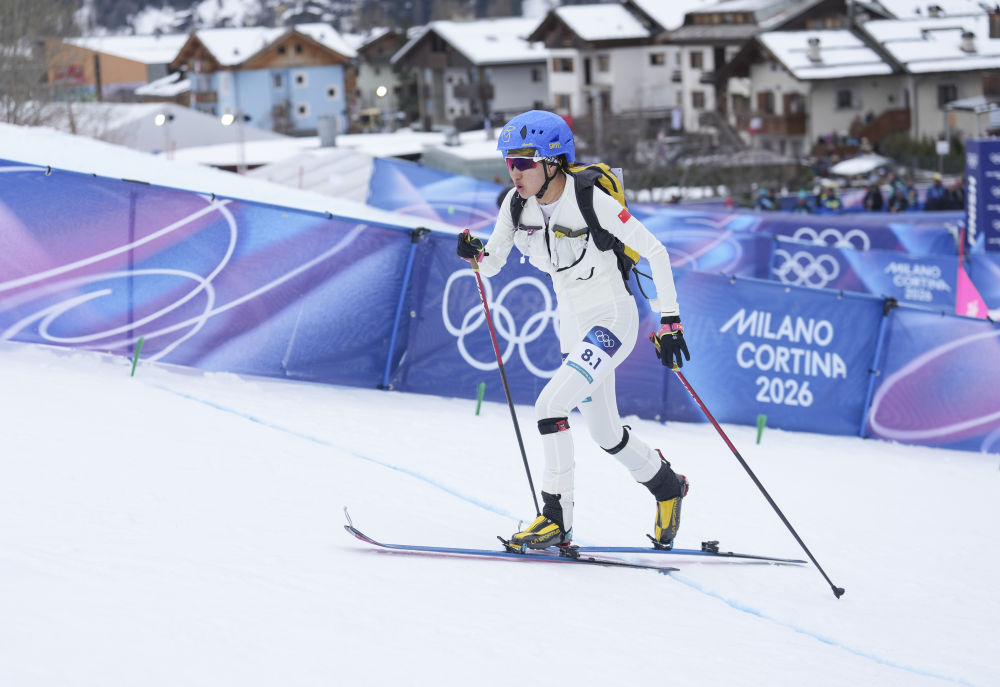 2026年2月21日,次旦玉珍在米兰-科尔蒂纳冬奥会滑雪登山混合接力的比赛中。新华社记者 颜麟蕴 摄