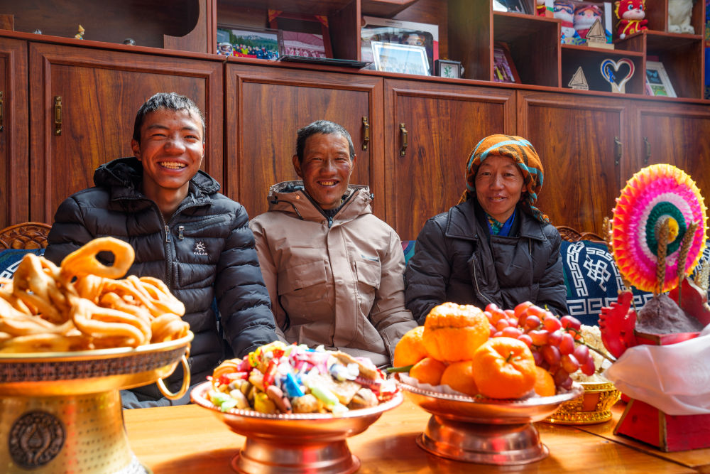 次旦玉珍的父亲旦增群培(中)、母亲德吉卓玛(右)和弟弟达瓦顿珠坐在家中,背后的书架上摆放着许多次旦玉珍的参赛照片和参赛纪念品(2026年2月7日摄)。新华社记者 丁增尼达 摄