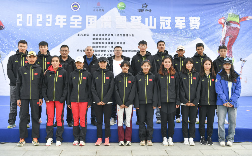 这是在首届全国滑雪登山冠军赛期间拍摄的布鲁尔(前排左一)、次旦玉珍(前排左五)和国家集训队合影(2023年4月7日摄)。新华社记者 胡虎虎 摄