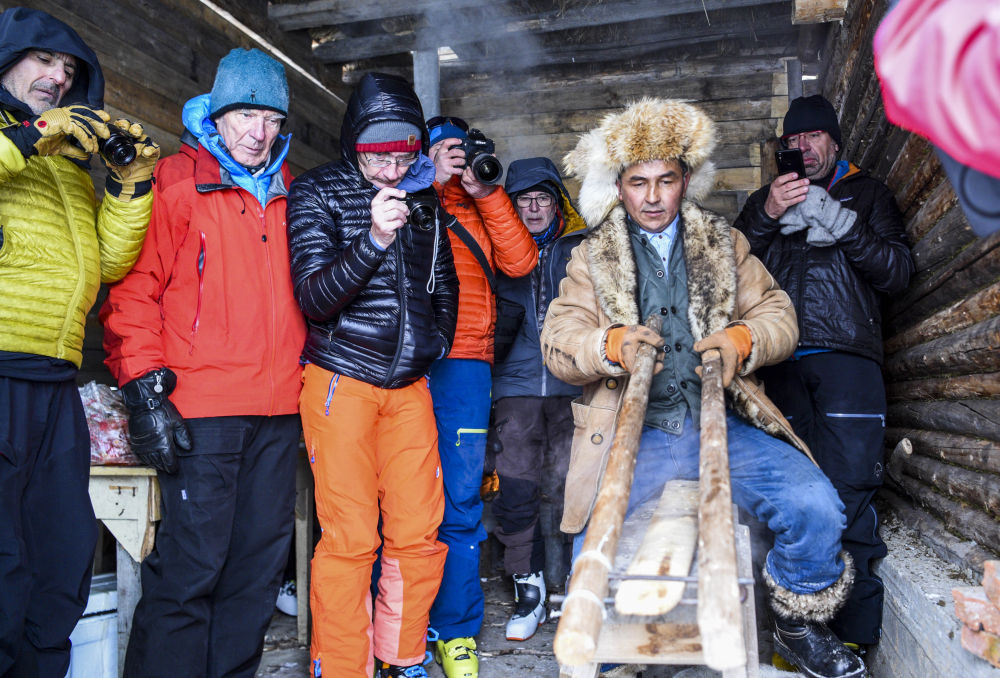 在新疆阿勒泰地区禾木村,来自欧洲的雪友观看牧民制作古老毛皮滑雪板(2019年1月10日摄)。新华社记者 胡虎虎 摄