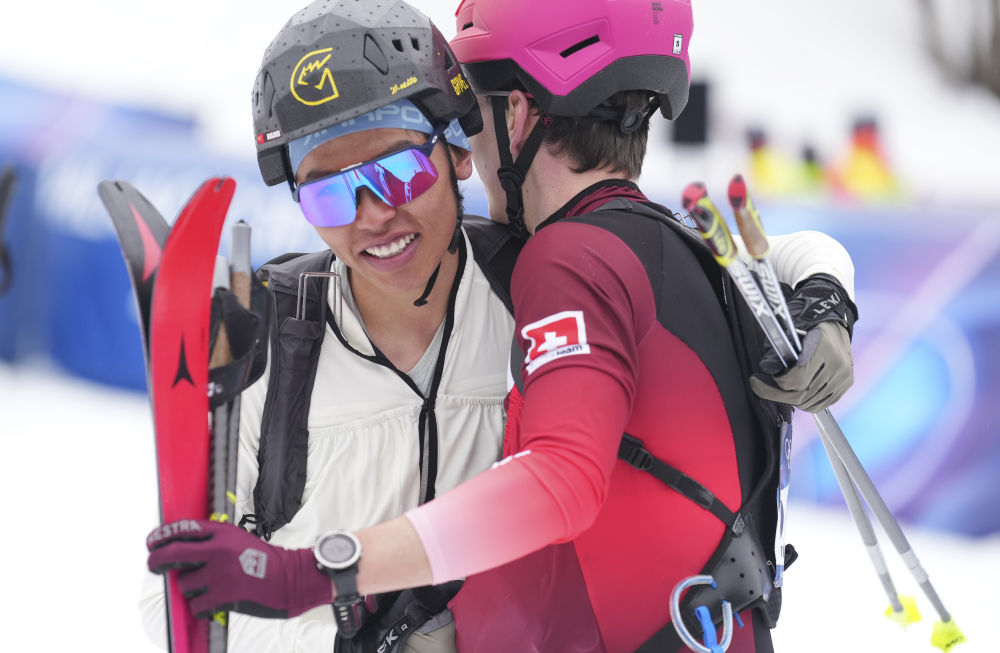 米兰-科尔蒂纳冬奥会滑雪登山混合接力比赛后,布鲁尔(左)与瑞士选手相拥致意(2026年2月21日摄)。新华社记者 胡虎虎 摄
